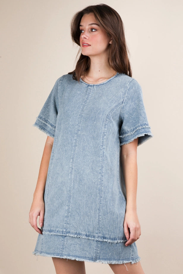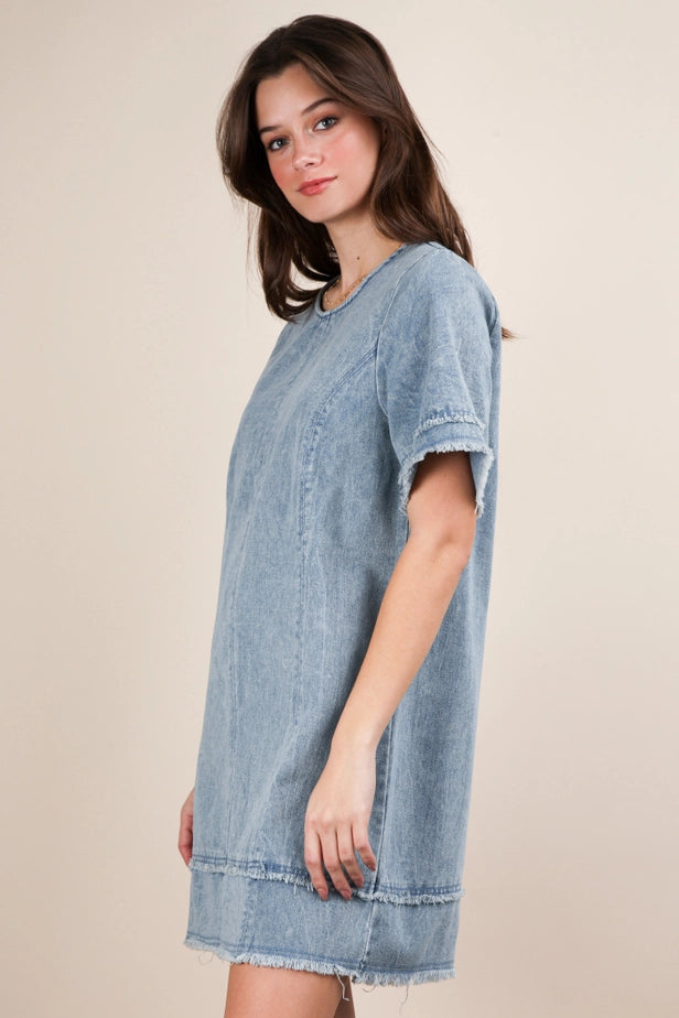 - Washed Denim Shift Mini Dress - Round Neck - Short Sleeve - Back Keyhole - Frayed Hem